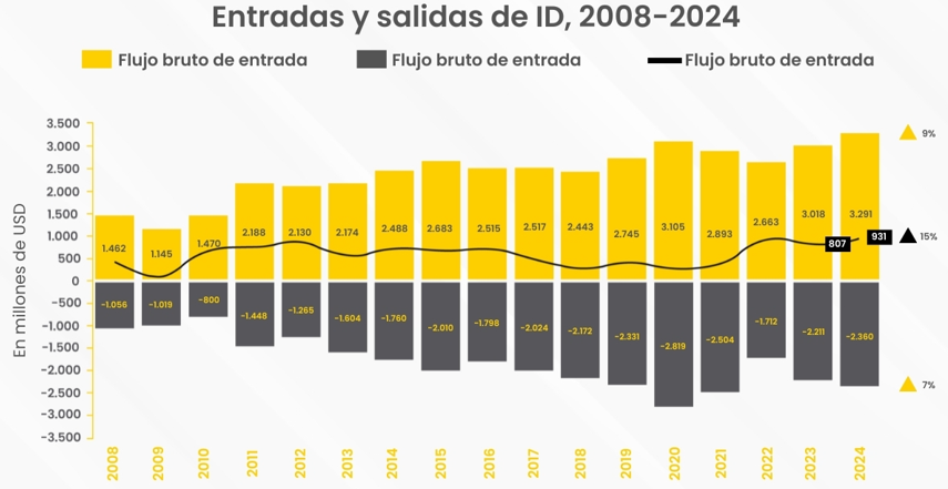 ▪︎ La ID en Paraguay creció 15% en 2024, con un flujo neto de USD 931 millones y un saldo total de USD 10.395 millones, un 3,8% más que en 2023.